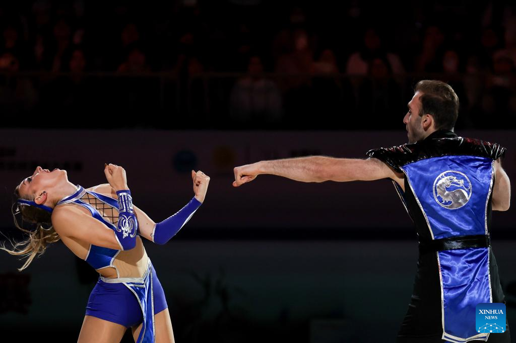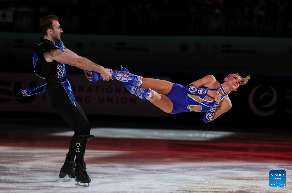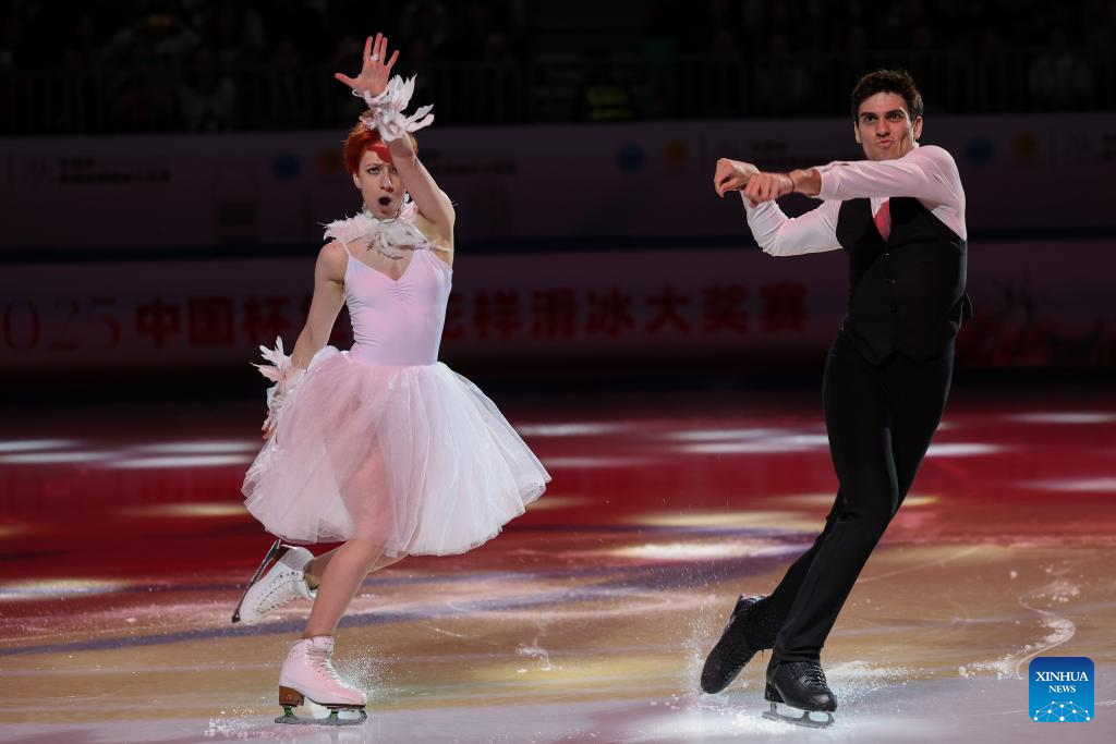 Anastasiia Metelkina (R)/Luka Berulava of Georgia perform during the exhibition gala at the Cup of China ISU Grand Prix of Figure Skating 2025 in southwest China's Chongqing Municipality, Oct. 26, 2025. (Xinhua/Huang Wei)