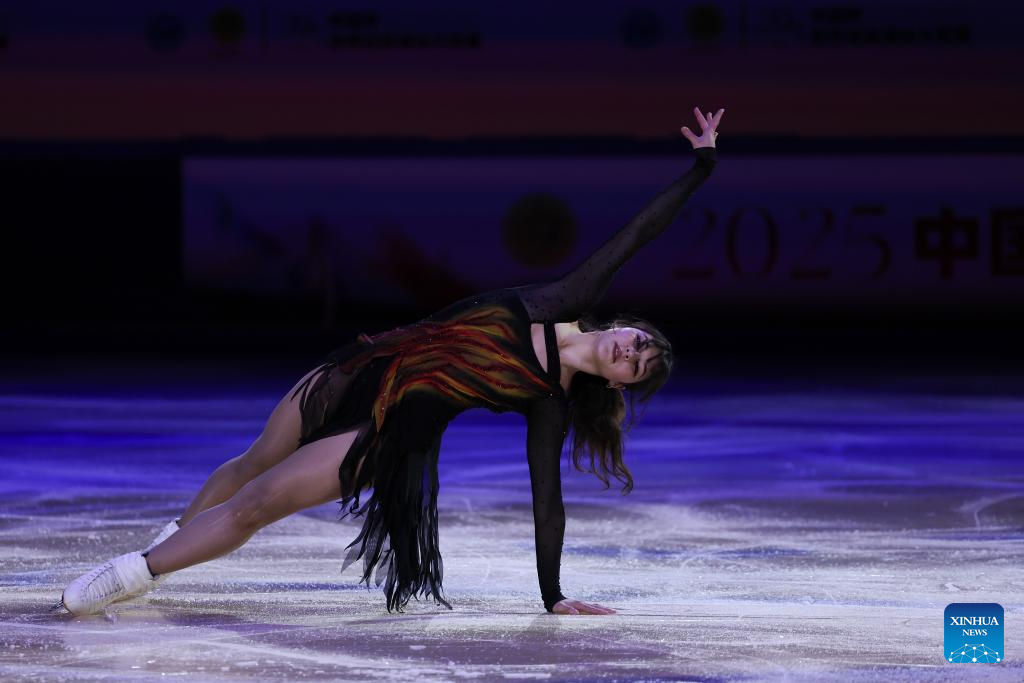 Zhang Ruiyang of China performs during the exhibition gala at the Cup of China ISU Grand Prix of Figure Skating 2025 in southwest China's Chongqing Municipality, Oct. 26, 2025. (Xinhua/Huang Wei)