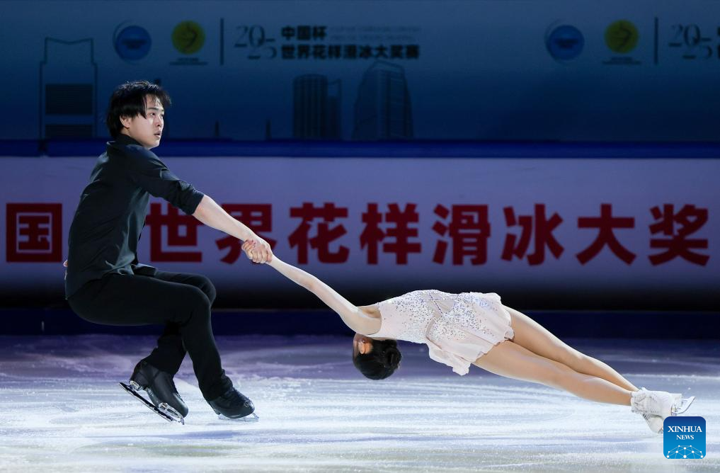 Zhang Jiaxuan (R)/Huang Yihang of China perform during the exhibition gala at the Cup of China ISU Grand Prix of Figure Skating 2025 in southwest China's Chongqing Municipality, Oct. 26, 2025. (Xinhua/Huang Wei)