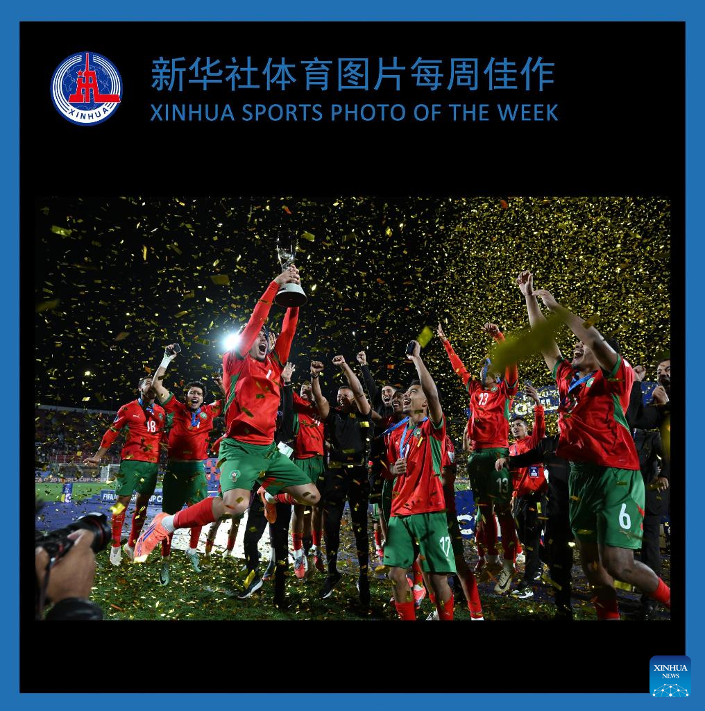 Team Morocco celebrate during the awarding ceremony after the final match between Argentina and Morocco at the FIFA U-20 World Cup Chile 2025 in Santiago, Chile, Oct. 19, 2025. (Photo by Jorge Villegas/Xinhua)