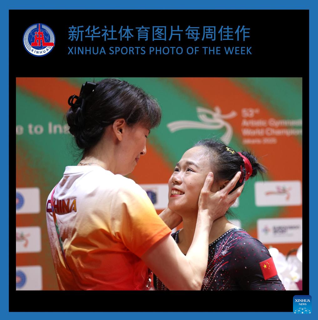 Zhang Qingying (R) of China celebrates with her coach Xu Jinglei after winning the women's balance beam final at 53rd FIG Artistic Gymnastics World Championships in Jakarta, Indonesia, Oct. 25, 2025. (Xinhua/Bai Xuefei)