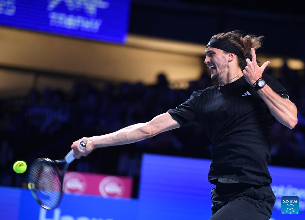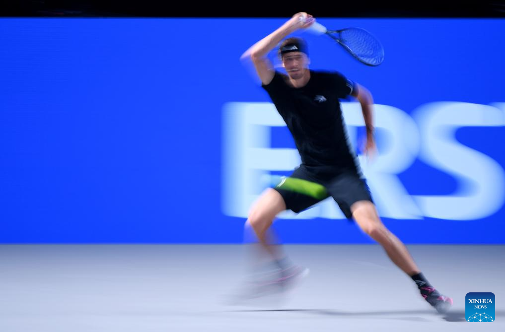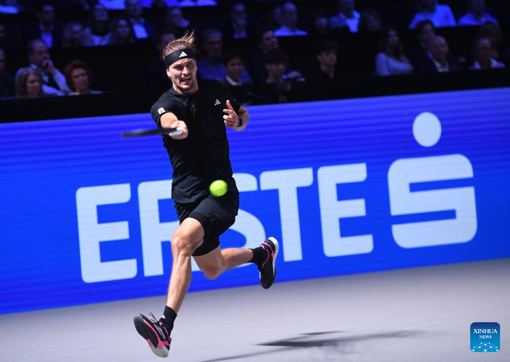 Alexander Zverev of Germany returns the ball during the men's single final match between Jannik Sinner of Italy and Alexander Zverev of Germany at ATP Tour Erste Bank Open in Vienna, Austria, Oct. 26, 2025. (Xinhua/He Canling)