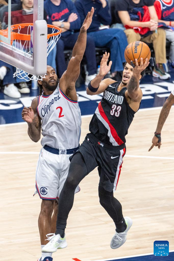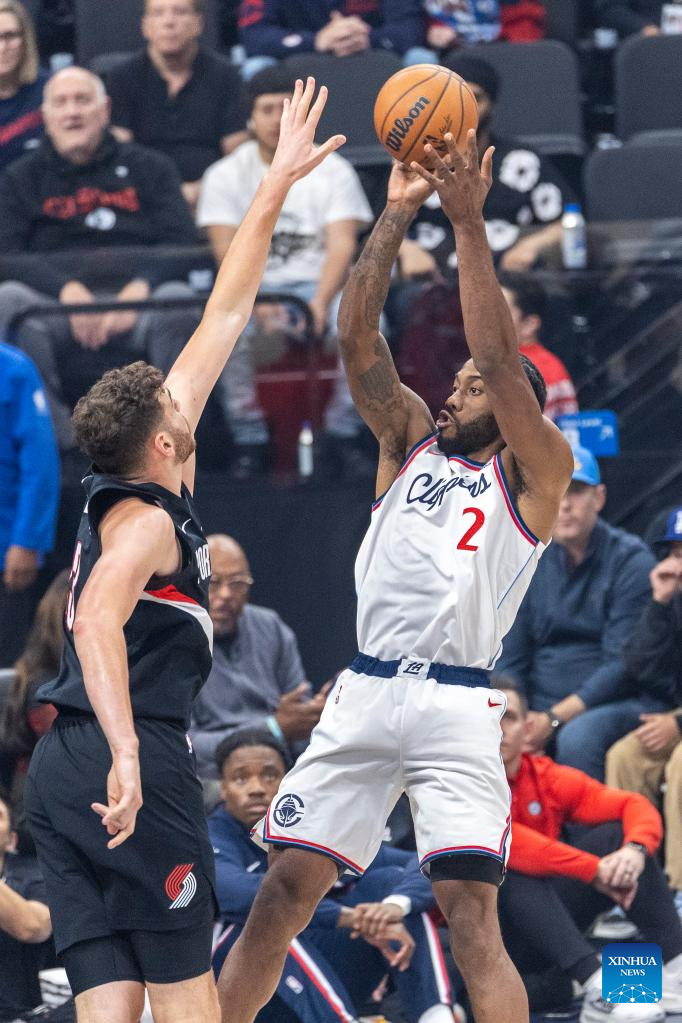 Los Angeles Clippers' Kawhi Leonard (R) shoots against Portland Trail Blazers' Donovan Clingan during the 2025-2026 NBA regular season match between Los Angeles Clippers and Portland Trail Blazers in Los Angeles, the United States, on Oct. 26, 2025. (Photo by Ringo Chiu/Xinhua)