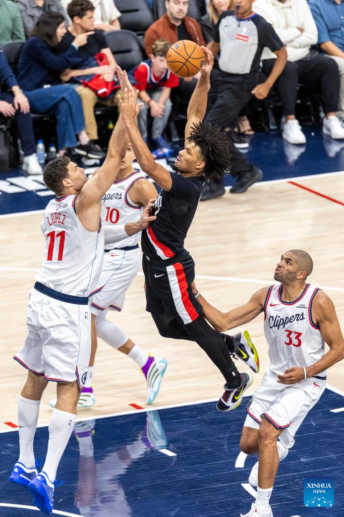 Portland Trail Blazers' Shaedon Sharpe (2nd R) goes to the basket during the 2025-2026 NBA regular season match between Los Angeles Clippers and Portland Trail Blazers in Los Angeles, the United States, on Oct. 26, 2025. (Photo by Ringo Chiu/Xinhua)