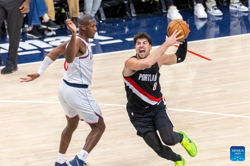 Portland Trail Blazers' Deni Avdija (R) drives against Los Angeles Clippers' Kris Dunn during the 2025-2026 NBA regular season match between Los Angeles Clippers and Portland Trail Blazers in Los Angeles, the United States, on Oct. 26, 2025. (Photo by Ringo Chiu/Xinhua)