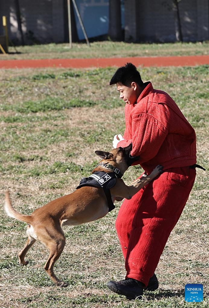A dog participates in a contest during a police dog skills competition in Beijing, capital of China, Oct. 26, 2025. The police dog skills competition of Beijing Municipal Public Security Bureau was held in Beijing from Oct. 24 to 27, with a total of 125 contestants and 108 police dogs from 19 teams attending the event. (Xinhua/Zhang Yuwei)
