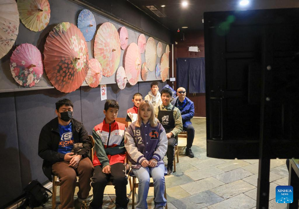 Physically impaired people communicate after a film screening at Trojan Fairy restaurant in Beijing, capital of China, Oct. 26, 2025. The Trojan Fairy restaurant, which focuses on supporting people with disabilities, hosted a film screening for 52 visually and physically impaired attendees. The event featured narrated audio descriptions to help visually impaired participants visualize scenes. (Xinhua/Yin Gang)
