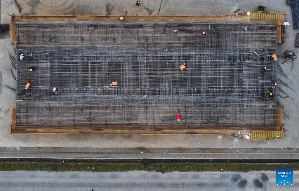 A drone photo shows workers operating at the beam fabrication site of the Shanghai-Nanjing section along the Shanghai-Chongqing-Chengdu High-speed Railway in Banjing Township of Rugao, east China's Jiangsu Province, Oct. 27, 2025. The box girder prefabrication work at this site has entered its final phase. (Xinhua/Ji Chunpeng)