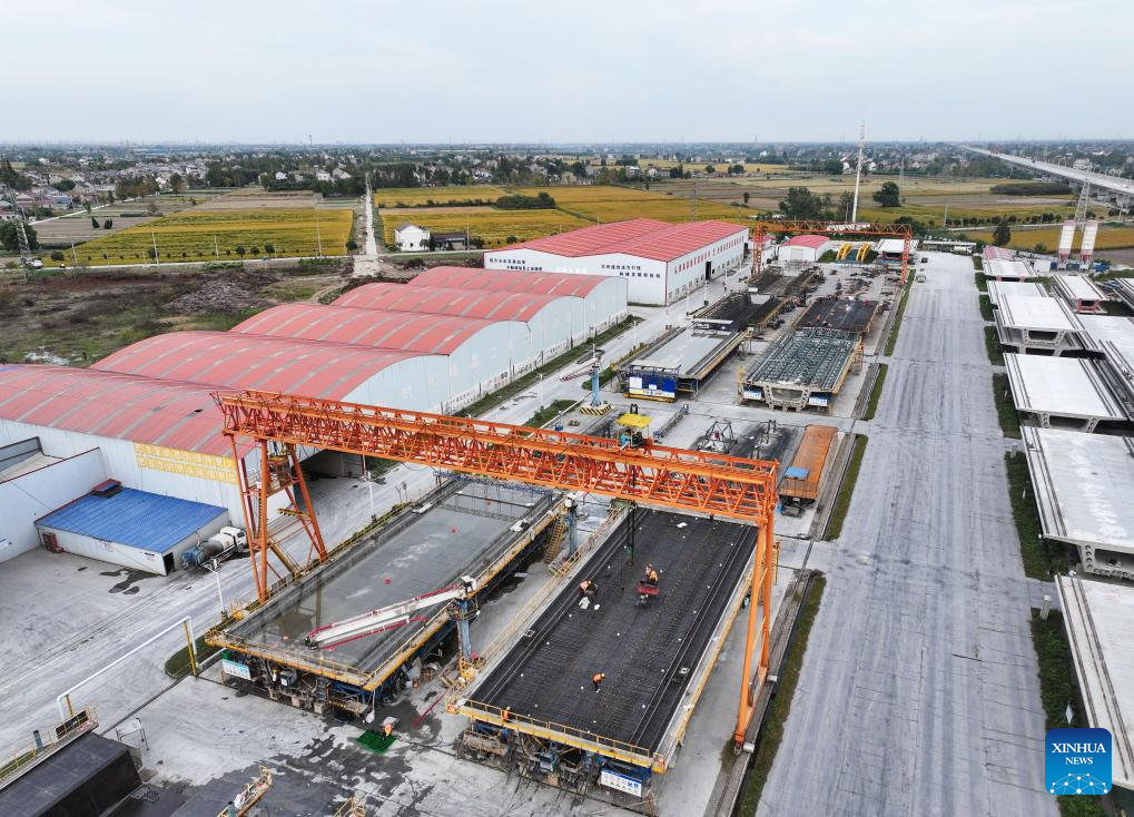 A drone photo shows a view of the beam fabrication site of the Shanghai-Nanjing section along the Shanghai-Chongqing-Chengdu High-speed Railway in Banjing Township of Rugao, east China's Jiangsu Province, Oct. 27, 2025. The box girder prefabrication work at this site has entered its final phase. (Xinhua/Ji Chunpeng)