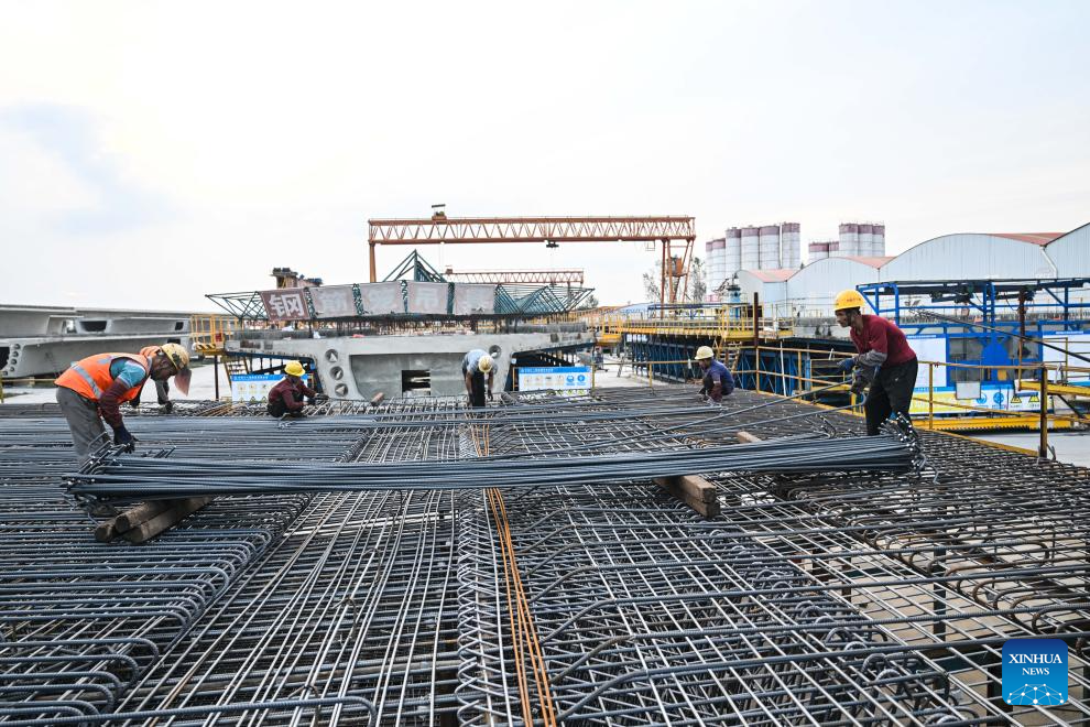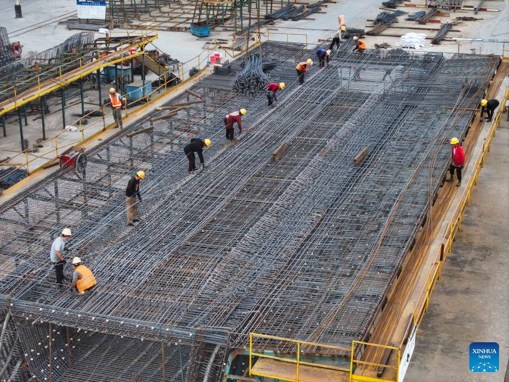 Workers operate at the beam fabrication site of the Shanghai-Nanjing section along the Shanghai-Chongqing-Chengdu High-speed Railway in Banjing Township of Rugao, east China's Jiangsu Province, Oct. 27, 2025. The box girder prefabrication work at this site has entered its final phase. (Xinhua/Ji Chunpeng)