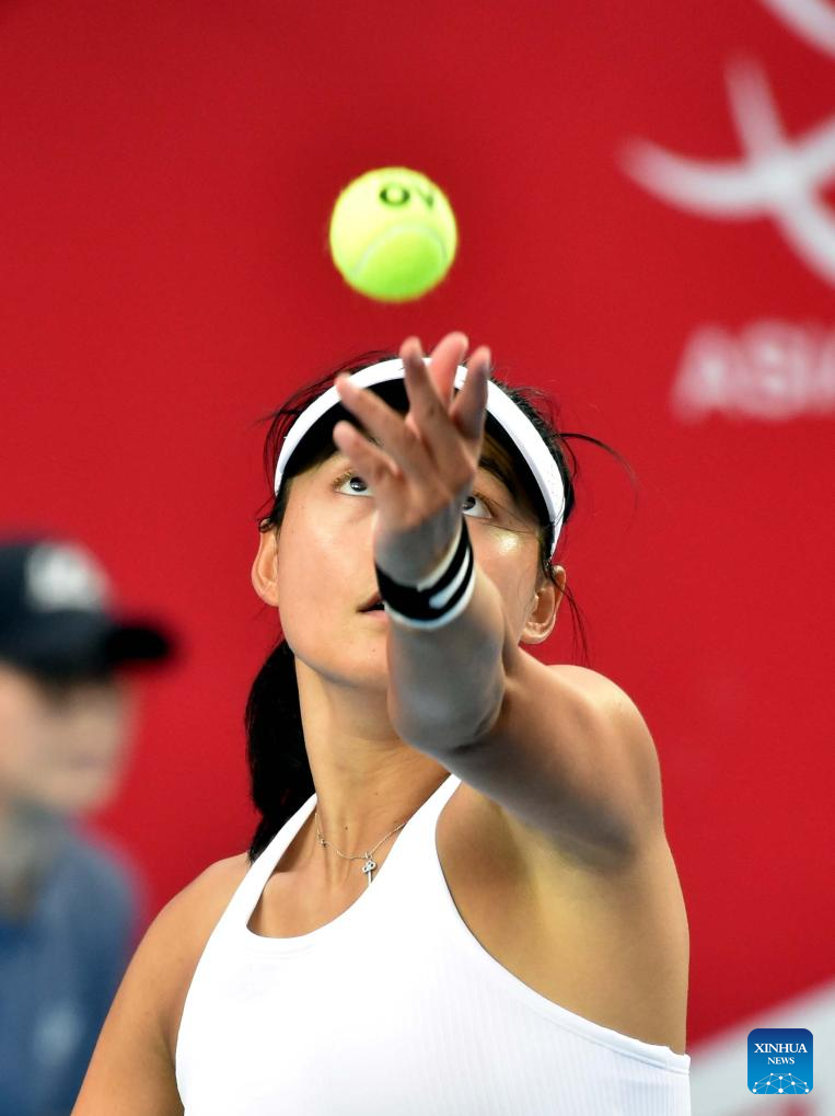 Wang Yafan serves during the women's singles round of 32 match between Wang Yafan of China and Maddison Inglis of Australia at the WTA Hong Kong Open tennis tournament in Hong Kong, South China, Oct. 27, 2025. (Xinhua/Lo Ping Fai)