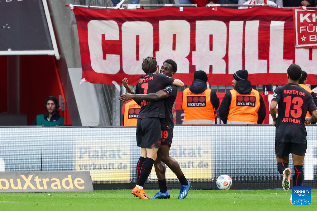 Ernest Poku (C) and Jonas Hofmann (L) of Bayer 04 Leverkusen celebrate scoring during the first division of Bundesliga football match between Bayer 04 Leverkusen and SC Freiburg in Leverkusen, Germany, Oct. 26. 2025. (Photo by Joachim Bywaletz/Xinhua)