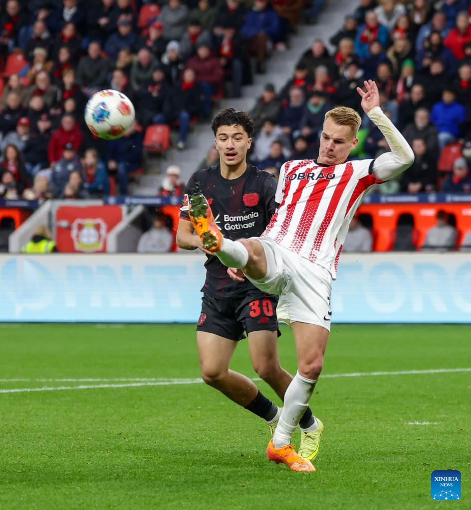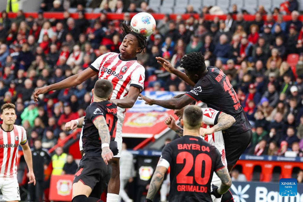 Loic Bade (top) of Bayer 04 Leverkusen heads for the ball during the first division of Bundesliga football match between Bayer 04 Leverkusen and SC Freiburg in Leverkusen, Germany, Oct. 26. 2025. (Photo by Joachim Bywaletz/Xinhua)