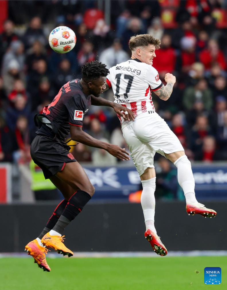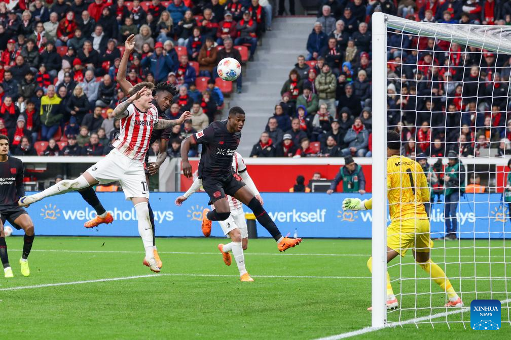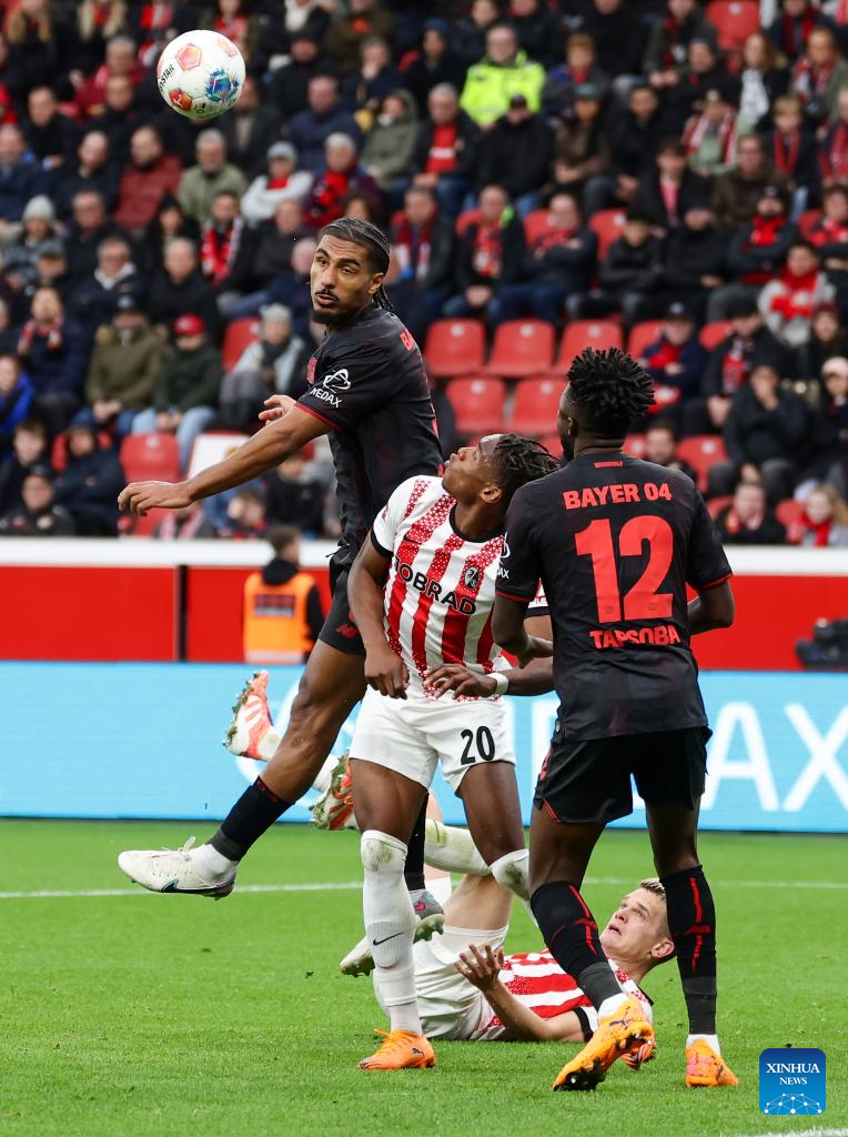 Edmond Tapsoba (2nd R) of Bayer 04 Leverkusen heads for the ball during the first division of Bundesliga football match between Bayer 04 Leverkusen and SC Freiburg in Leverkusen, Germany, Oct. 26. 2025. (Photo by Joachim Bywaletz/Xinhua)