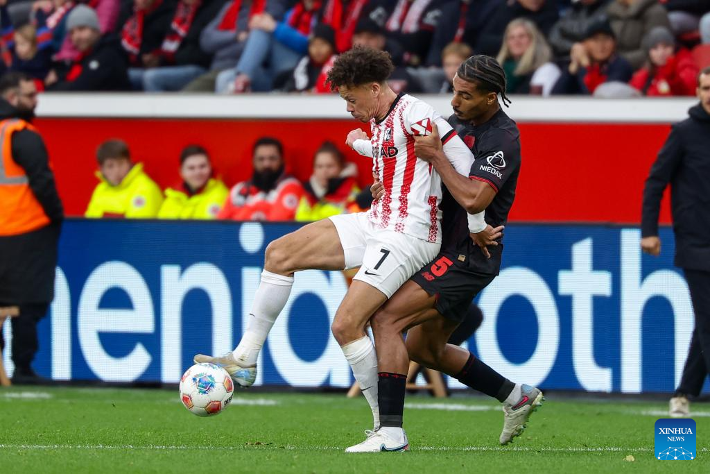 Ibrahim Maza (L) of Bayer 04 Leverkusen vies with Max Rosenfelder of SC Freiburg during the first division of Bundesliga football match between Bayer 04 Leverkusen and SC Freiburg in Leverkusen, Germany, Oct. 26. 2025. (Photo by Joachim Bywaletz/Xinhua)