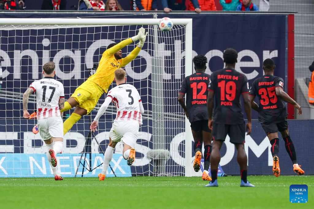 Goalkeeper of SC Freiburg Noah Atubolu (rear) makes a save during the first division of Bundesliga football match between Bayer 04 Leverkusen and SC Freiburg in Leverkusen, Germany, Oct. 26. 2025. (Photo by Joachim Bywaletz/Xinhua)