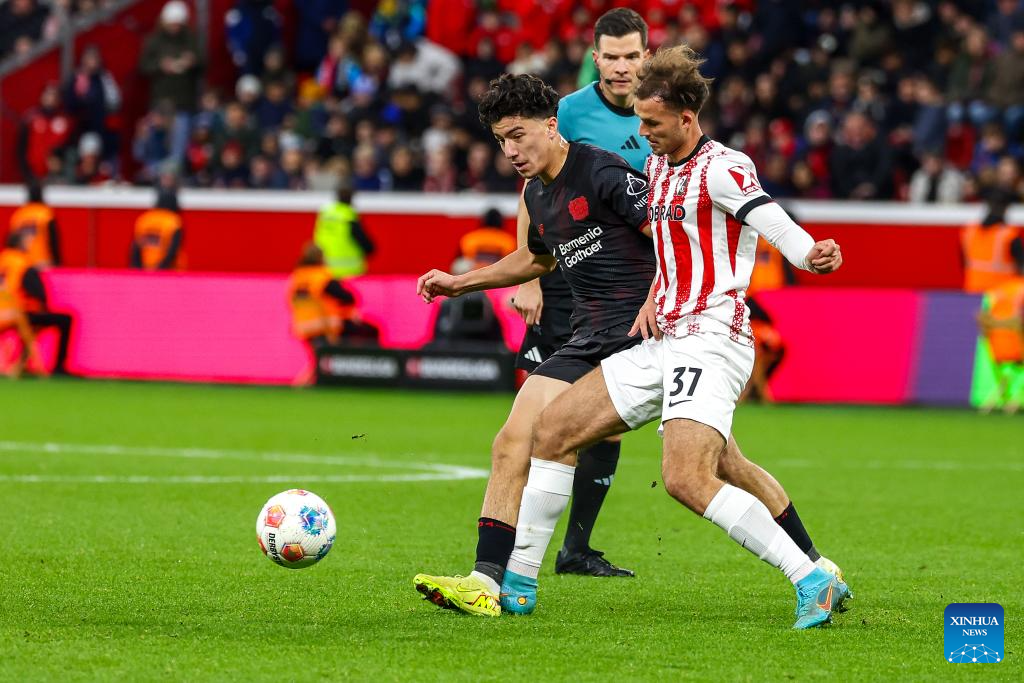 Ibrahim Maza (L) of Bayer 04 Leverkusen vies with Philipp Lienhart of SC Freiburg during the first division of Bundesliga football match between Bayer 04 Leverkusen and SC Freiburg in Leverkusen, Germany, Oct. 26. 2025. (Photo by Joachim Bywaletz/Xinhua)