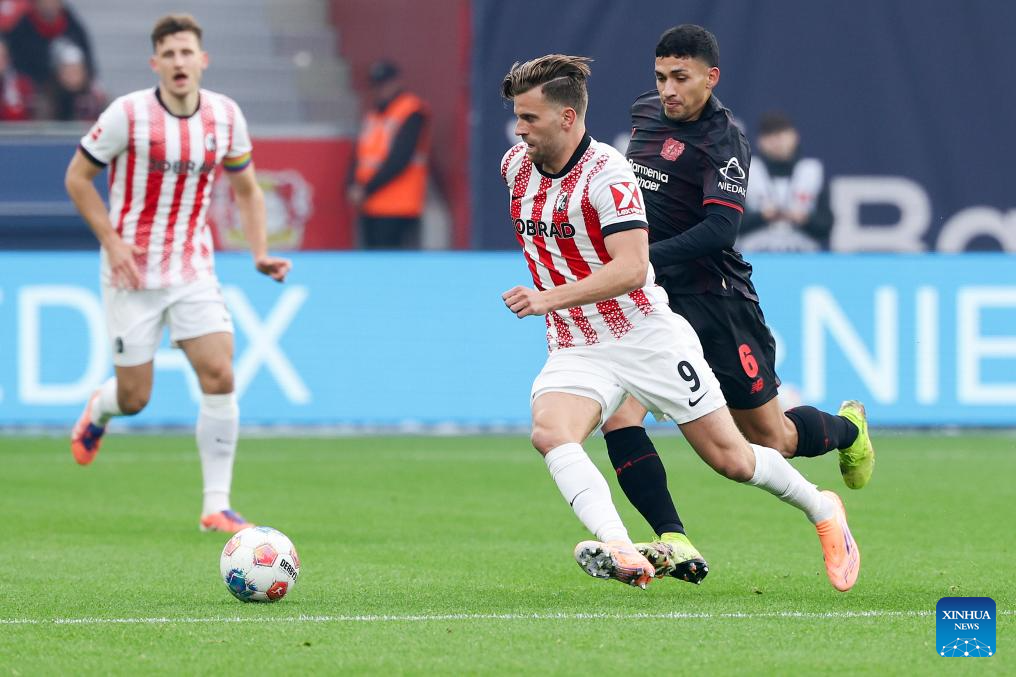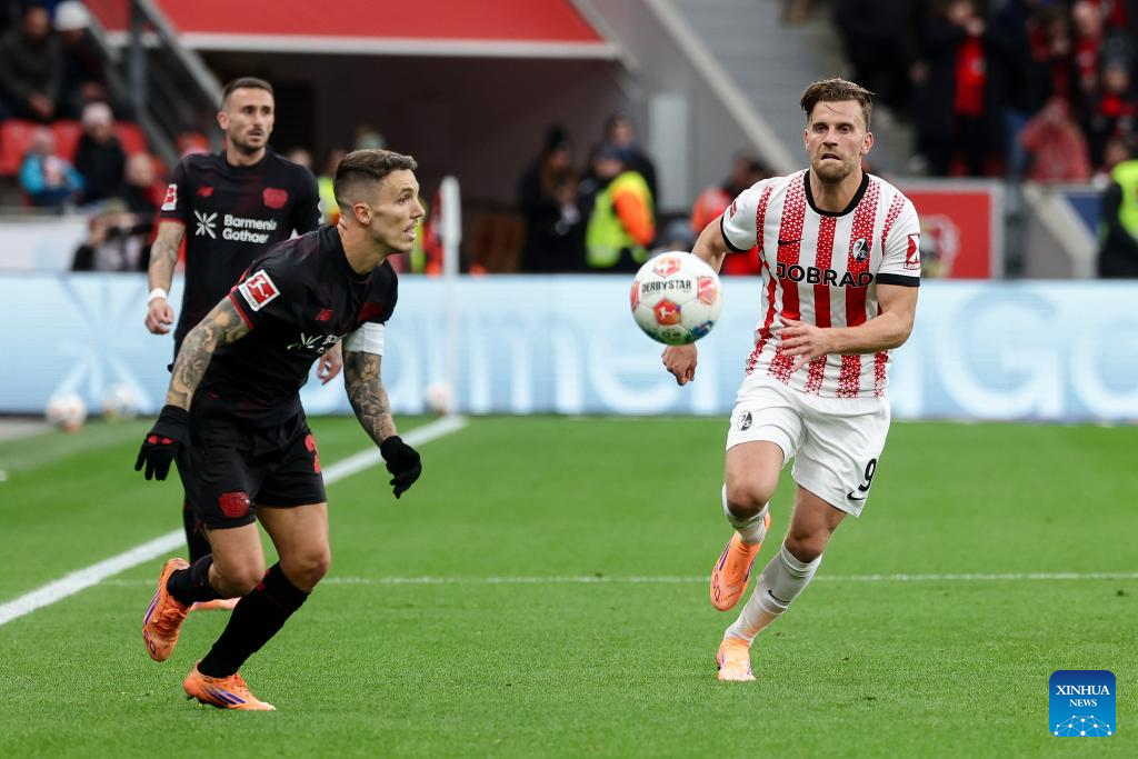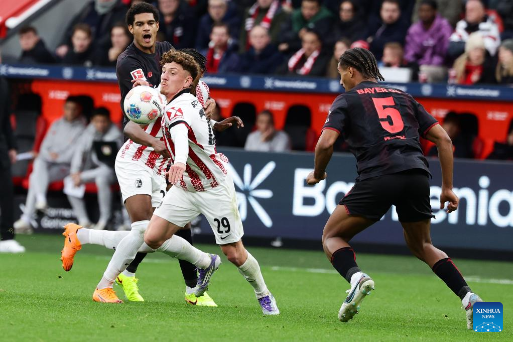 Loic Bade (R, front) of Bayer 04 Leverkusen vies with Philipp Treu (L, front) of SC Freiburg during the first division of Bundesliga football match between Bayer 04 Leverkusen and SC Freiburg in Leverkusen, Germany, Oct. 26. 2025. (Photo by Joachim Bywaletz/Xinhua)