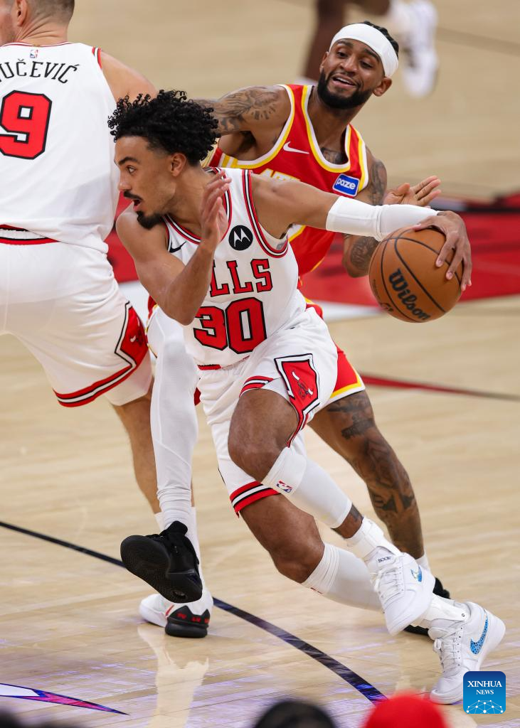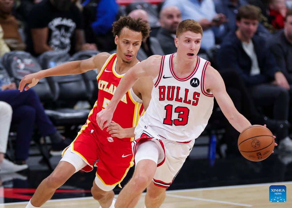 Kevin Huerter (R) of Chicago Bulls dribbles the ball during the NBA regular season basketball game between Chicago Bulls and Atlanta Hawks at United Center in Chicago, the United States, on Oct. 27, 2025. (Photo by Joel Lerner/Xinhua)