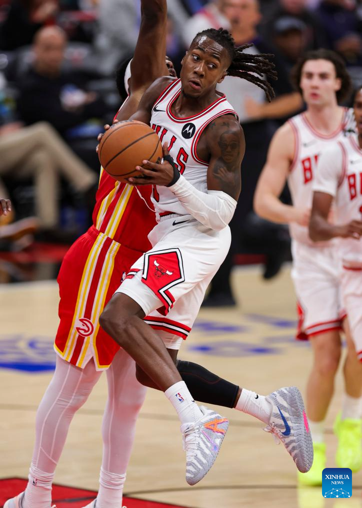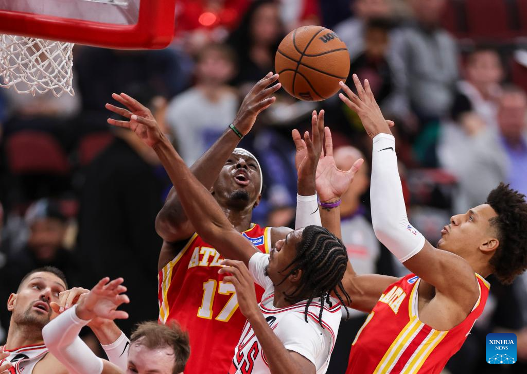 Onyeka Okongwu (top L) and Jalen Johnson (1st R) of Atlanta Hawks battle for a rebound with Julian Phillips (2nd R) of Chicago Bulls during the NBA regular season basketball game between Chicago Bulls and Atlanta Hawks at United Center in Chicago, the United States, on Oct. 27, 2025. (Photo by Joel Lerner/Xinhua)