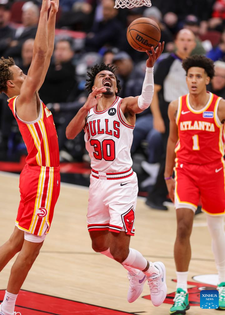 Tre Jones (C) of Chicago Bulls goes for a lay-up during the NBA regular season basketball game between Chicago Bulls and Atlanta Hawks at United Center in Chicago, the United States, on Oct. 27, 2025. (Photo by Joel Lerner/Xinhua)