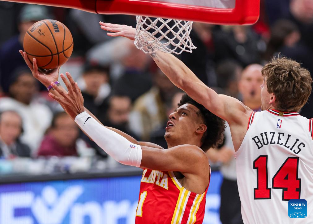Jalen Johnson (L) of Atlanta Hawks goes for a lay-up past Matas Buzelis of Chicago Bulls during the NBA regular season basketball game between Chicago Bulls and Atlanta Hawks at United Center in Chicago, the United States, on Oct. 27, 2025. (Photo by Joel Lerner/Xinhua)
