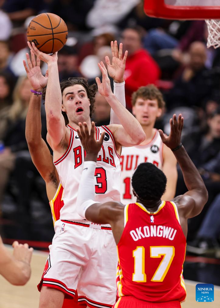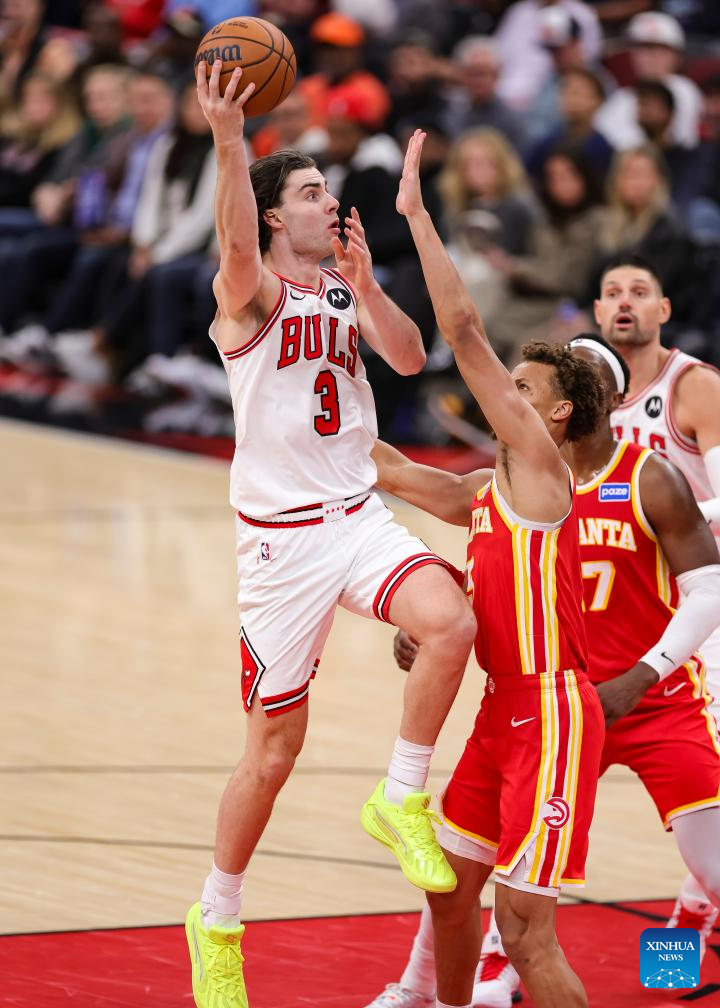 Josh Giddey (L) of Chicago Bulls shoots during the NBA regular season basketball game between Chicago Bulls and Atlanta Hawks at United Center in Chicago, the United States, on Oct. 27, 2025. (Photo by Joel Lerner/Xinhua)