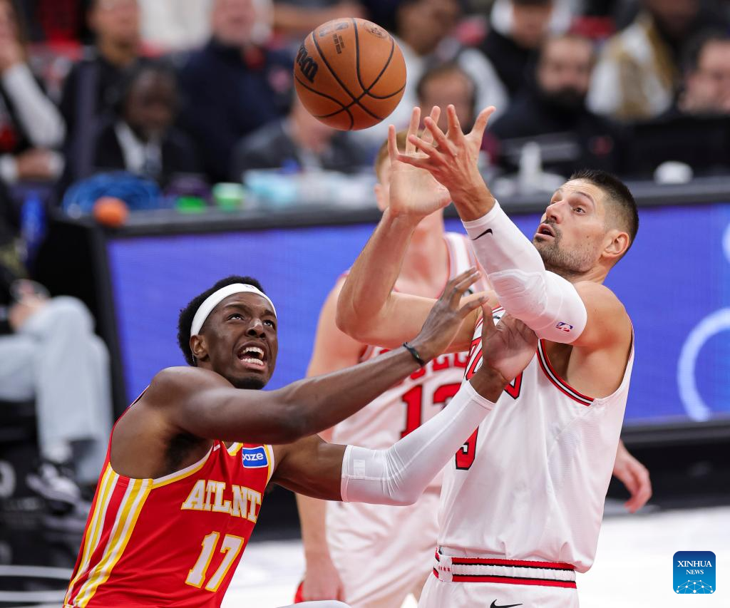 Onyeka Okongwu (L) of Atlanta Hawks defends Nikola Vucevic of Chicago Bulls during the NBA regular season basketball game between Chicago Bulls and Atlanta Hawks at United Center in Chicago, the United States, on Oct. 27, 2025. (Photo by Joel Lerner/Xinhua)