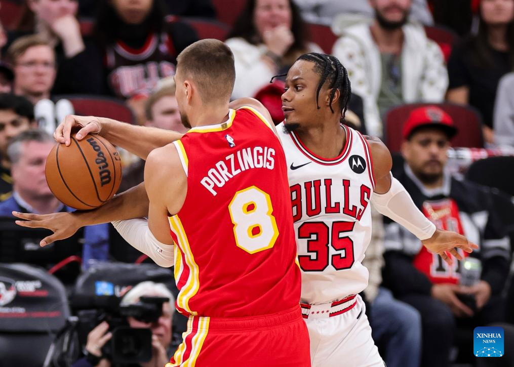 Isaac Okoro (R) of Chicago Bulls and Kristaps Porzingis of Atlanta Hawks fight for the ball during the NBA regular season basketball game between Chicago Bulls and Atlanta Hawks at United Center in Chicago, the United States, on Oct. 27, 2025. (Photo by Joel Lerner/Xinhua)