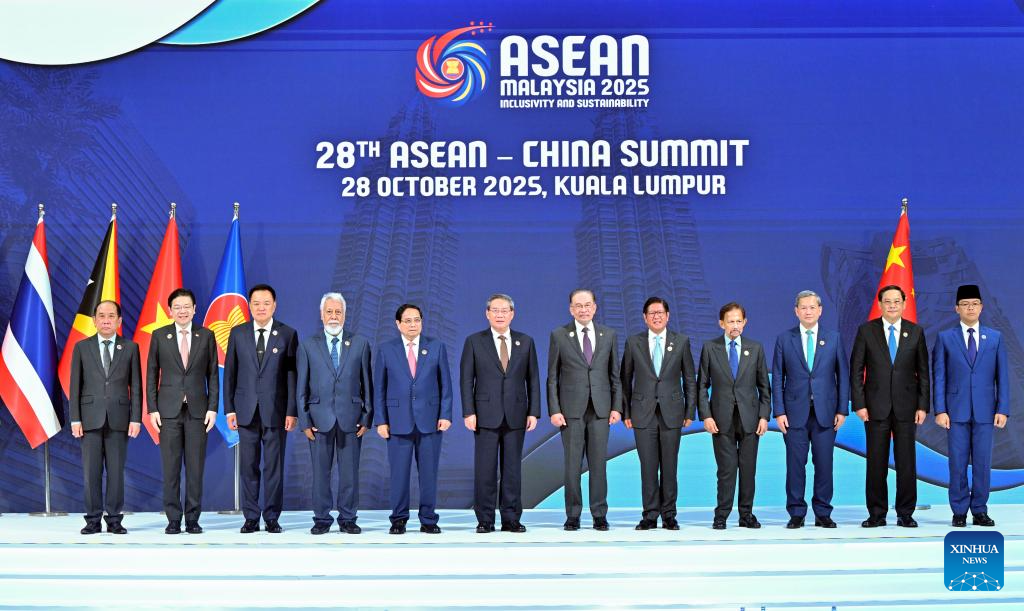 Chinese Premier Li Qiang poses for a group photo while attending the 28th China-ASEAN Summit in Kuala Lumpur, Malaysia, Oct. 28, 2025. (Xinhua/Yin Bogu)