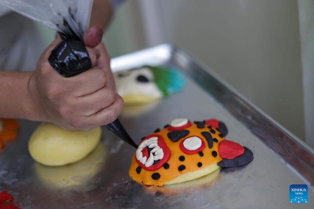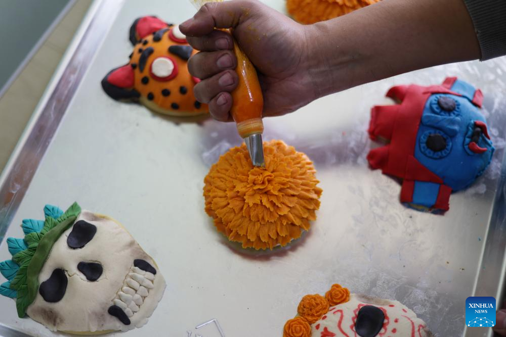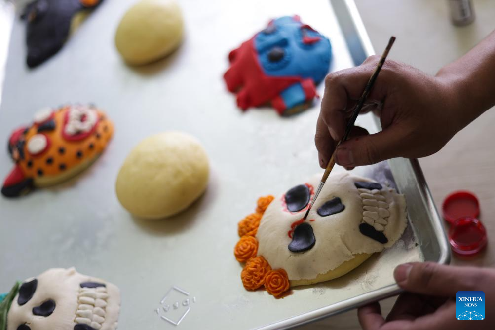 A baker makes "pan de muerto", a traditional Mexican bread for the Day of the Dead celebrations, in a bakery in Mexico City, capital of Mexico, Oct. 27, 2025. (Photo by Francisco Canedo/Xinhua)
