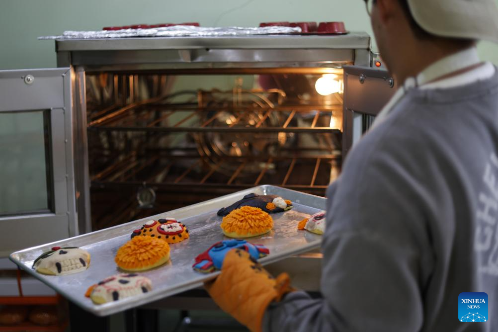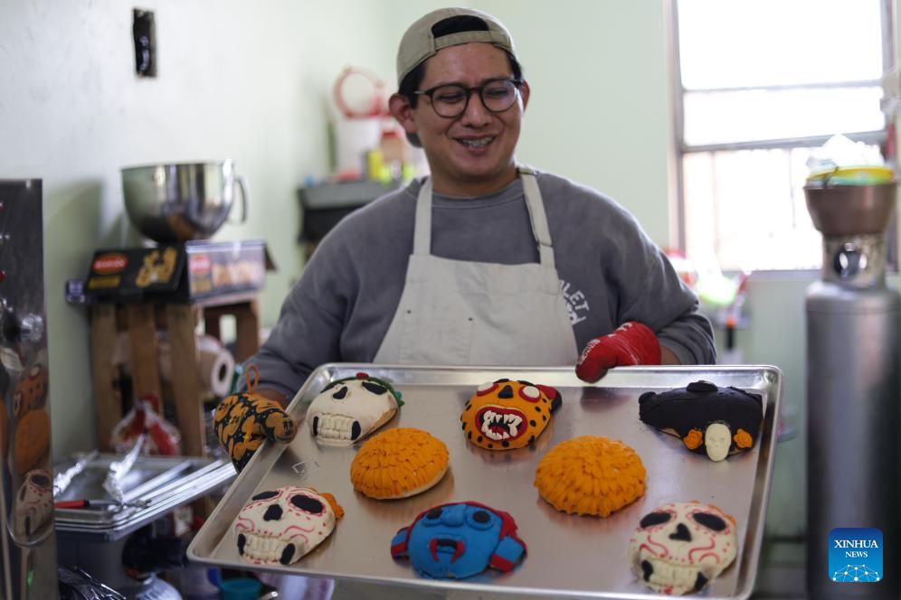 A baker shows "pan de muerto", a traditional Mexican bread for the Day of the Dead celebrations, in a bakery in Mexico City, capital of Mexico, Oct. 27, 2025. (Photo by Francisco Canedo/Xinhua)