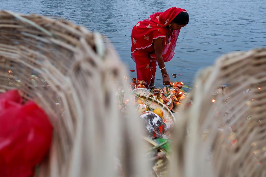 KATHMANDU, Oct. 28 (Xinhua) -- People get together beside the river to celebrate the Chhath festival, which is dedicated to the sun with Hindu devotees making offerings to the setting and rising sun.