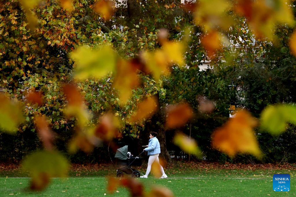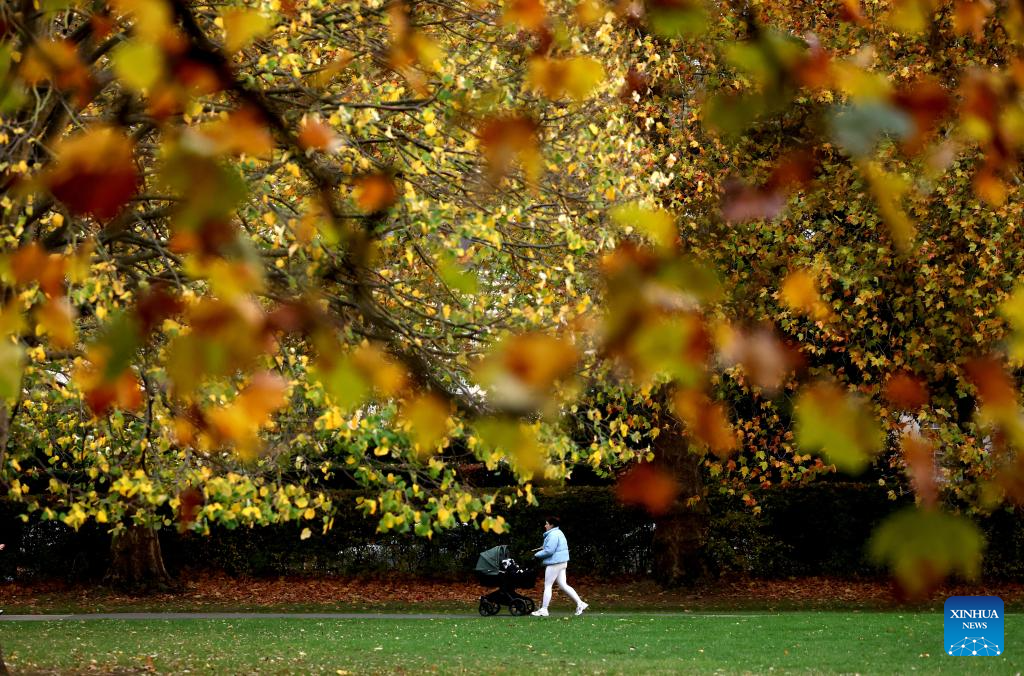 A woman pushes a stroller in Regent's Park in London, Britain, Oct. 27, 2025. (Xinhua/Li Ying)