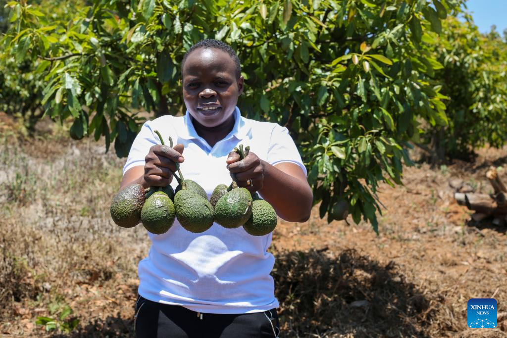 Juliana Yotham Mwalyepelo, chief executive officer of Chrises Real Solutions Company Limited, displays avocados at a farm in Njombe, southern Tanzania, Oct. 25, 2025. (Xinhua/Nurdin Pallangyo)