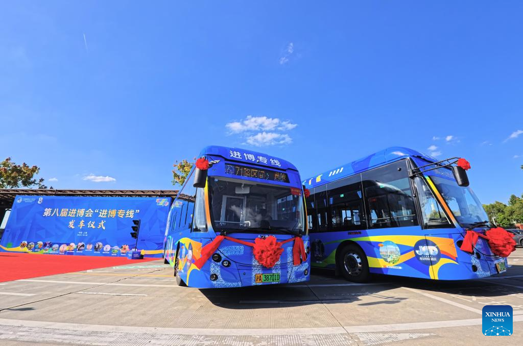 Buses of the special line of the 8th China International Import Expo (CIIE) are seen at the launch ceremony in east China's Shanghai, Oct. 29, 2025. The 8th CIIE special line launched in Shanghai, operating from Nov. 1 to 30. Blue-themed buses will shuttle between the Bund and the National Exhibition and Convention Center (Shanghai), with additional tours to some popular downtown areas. (Xinhua/Fang Zhe)