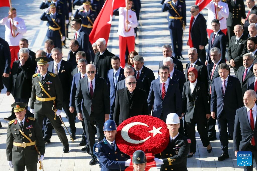 Turkish President Recep Tayyip Erdogan (C) visits Anitkabir, the mausoleum of the founder of Turkish Republic Mustafa Kemal Ataturk, to celebrate the Republic Day in Ankara, Türkiye, Oct. 29, 2025. Türkiye celebrated its Republic Day to mark the 102nd anniversary of the founding of the Republic of Türkiye. (Mustafa Kaya/Handout via Xinhua)