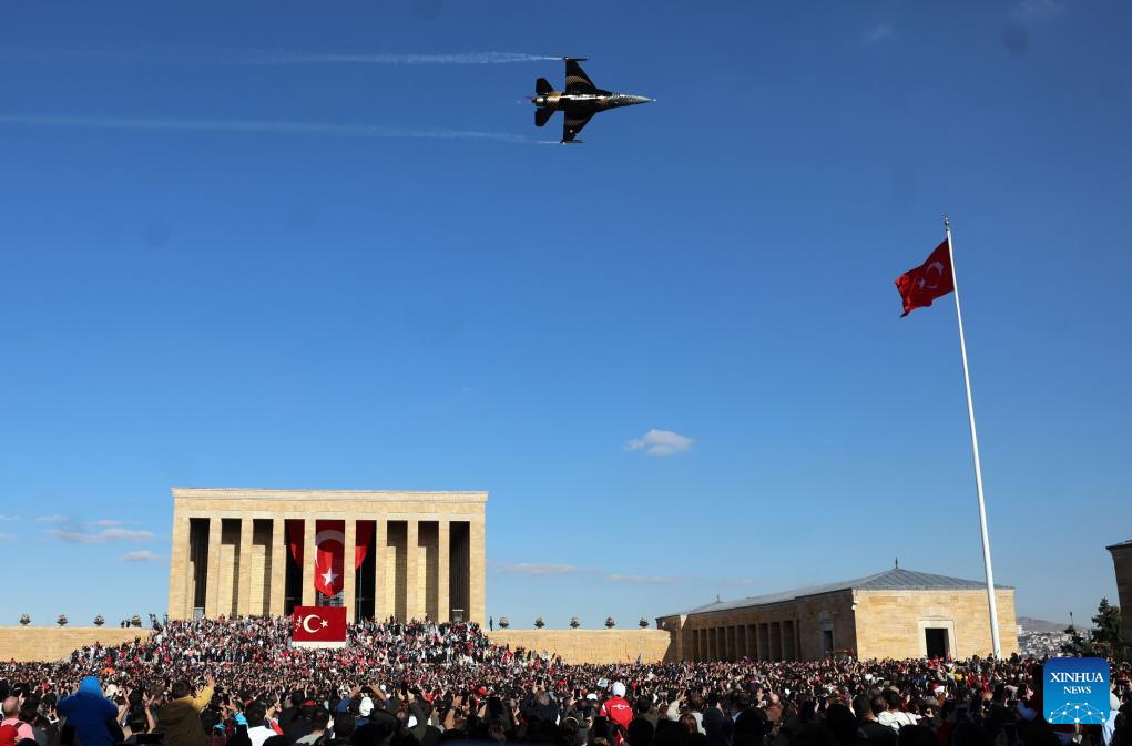 An F-16 fighter jet from the Turkish solo aerobatic demonstration team, Soloturk, flies over Anitkabir, the mausoleum of the founder of Turkish Republic Mustafa Kemal Ataturk, to celebrate the Republic Day in Ankara, Türkiye, Oct. 29, 2025. Türkiye celebrated its Republic Day to mark the 102nd anniversary of the founding of the Republic of Türkiye. (Mustafa Kaya/Handout via Xinhua)