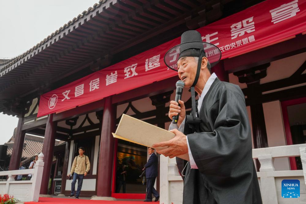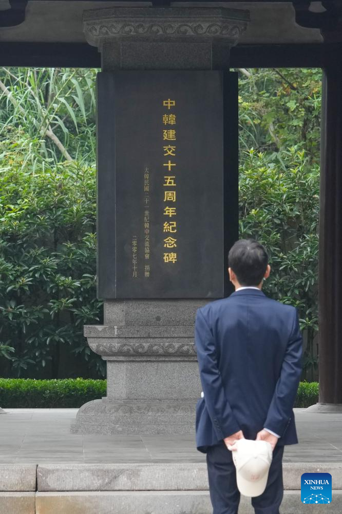 A delegation from South Korea holds a memorial ceremony at the Memorial Hall of Choe Chi-won in Yangzhou, east China's Jiangsu Province, Oct. 15, 2025.