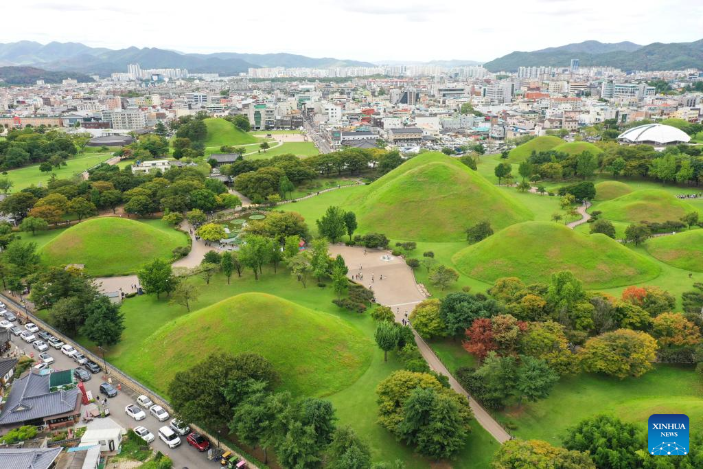 An aerial drone photo taken on Sept. 21, 2025 shows Daereungwon ancient tomb complex in Gyeongju, South Korea.