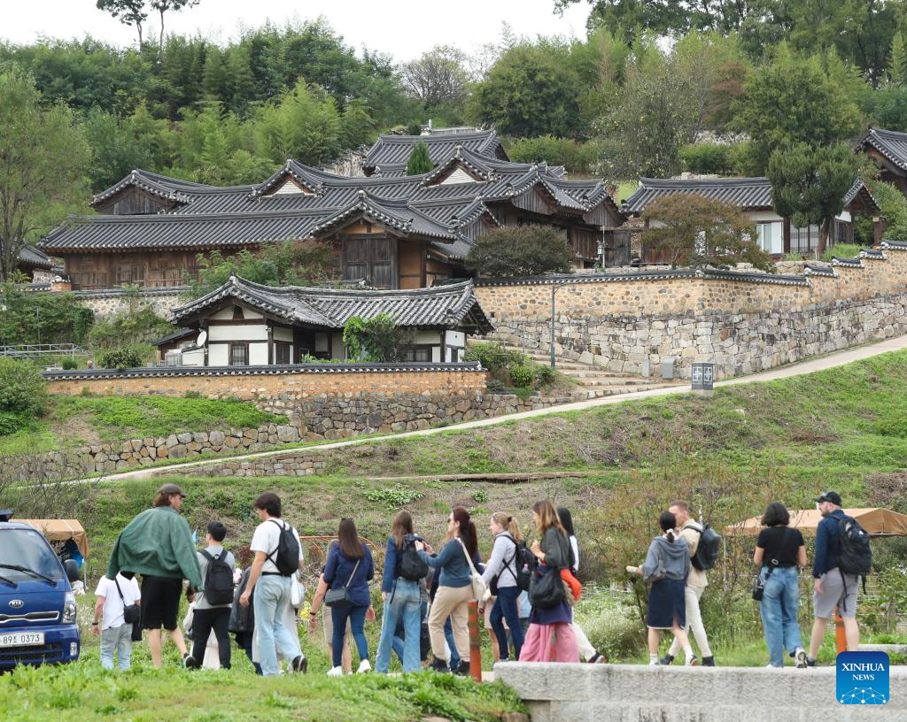 Tourists visit an ancient village in Gyeongju, South Korea, Oct. 17, 2025.