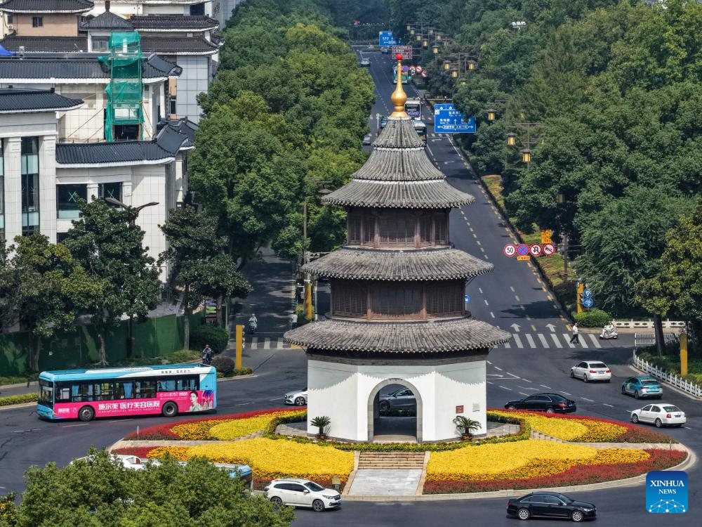 An aerial drone photo taken on Oct. 11, 2025 shows a view of the Wenchang Pavilion in Yangzhou, east China's Jiangsu Province.