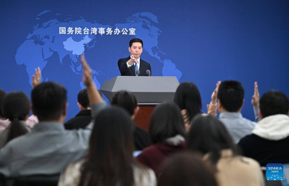 Peng Qing'en, a spokesperson for the State Council Taiwan Affairs Office, gestures at a press conference in Beijing, capital of China, Oct. 29, 2025. (Xinhua/Chen Yehua)