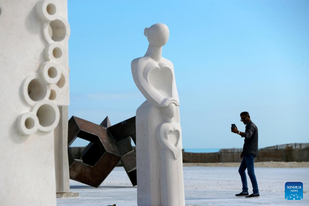 Photo taken on Oct. 27, 2025 shows sculptures created during the Egypt Sculpture Symposium in New Alamein City, Matrouh Governorate, Egypt. Under the Mediterranean sky, rows of white sculptures rise along the seaside promenade of New Alamein, an emerging city. Abstract forms and graceful human figures stand in silent dialogue with the sea, turning the esplanade into an open-air gallery that speaks to New Alamein's modern identity. (Xinhua/Ahmed Gomaa)