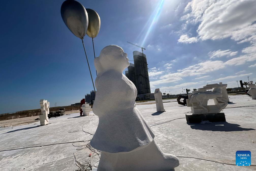 Photo taken on Oct. 27, 2025 shows a sculpture created during the Egypt Sculpture Symposium in New Alamein City, Matrouh Governorate, Egypt. Under the Mediterranean sky, rows of white sculptures rise along the seaside promenade of New Alamein, an emerging city. Abstract forms and graceful human figures stand in silent dialogue with the sea, turning the esplanade into an open-air gallery that speaks to New Alamein's modern identity. (Xinhua/Ahmed Gomaa)