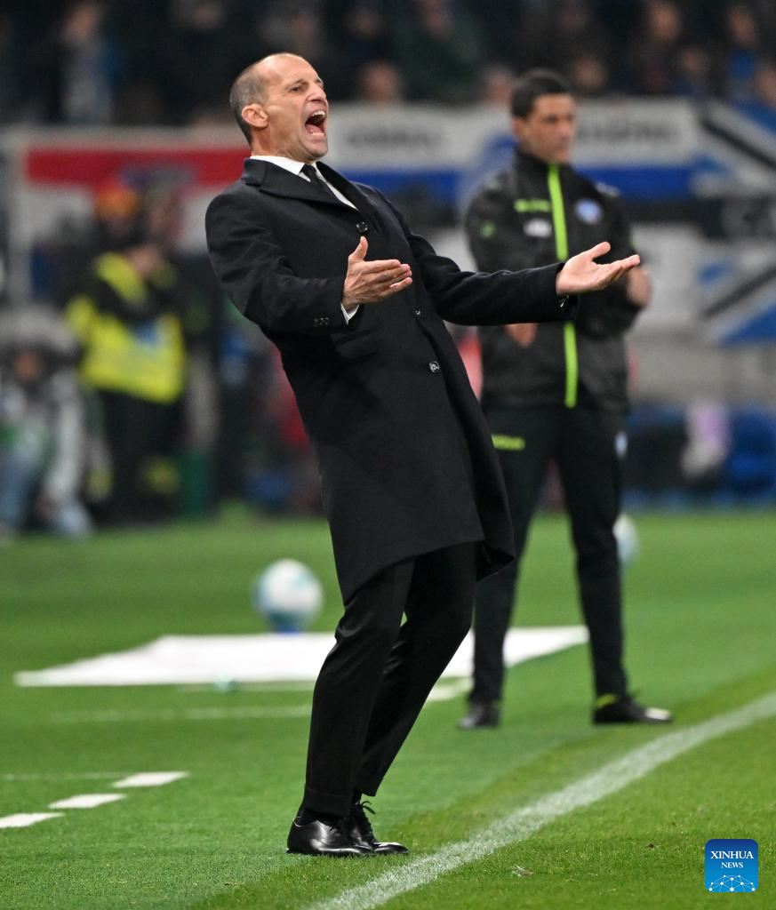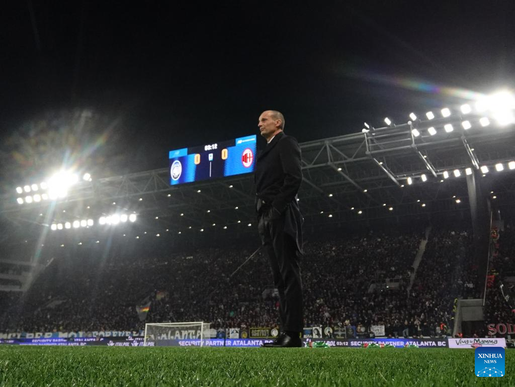 AC Milan's head coach Massimiliano Allegri reacts during a Serie A football match between Atalanta and AC Milan in Bergamo, Italy, Oct. 28, 2025. (Photo by Alberto Lingria/Xinhua)