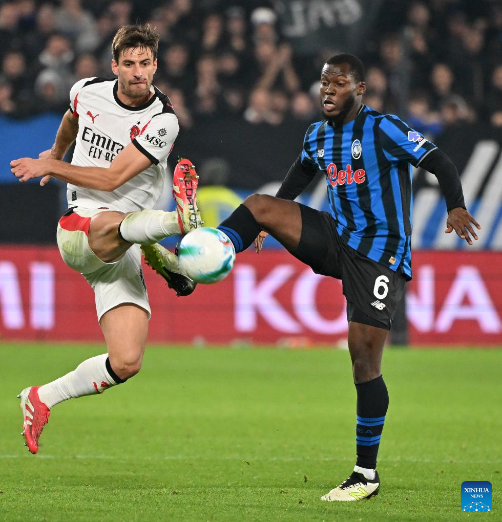 AC Milan's Matteo Gabbia (L) vies with Atalanta's Honest Ahanor during a Serie A football match between Atalanta and AC Milan in Bergamo, Italy, Oct. 28, 2025. (Photo by Alberto Lingria/Xinhua)