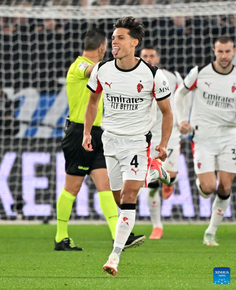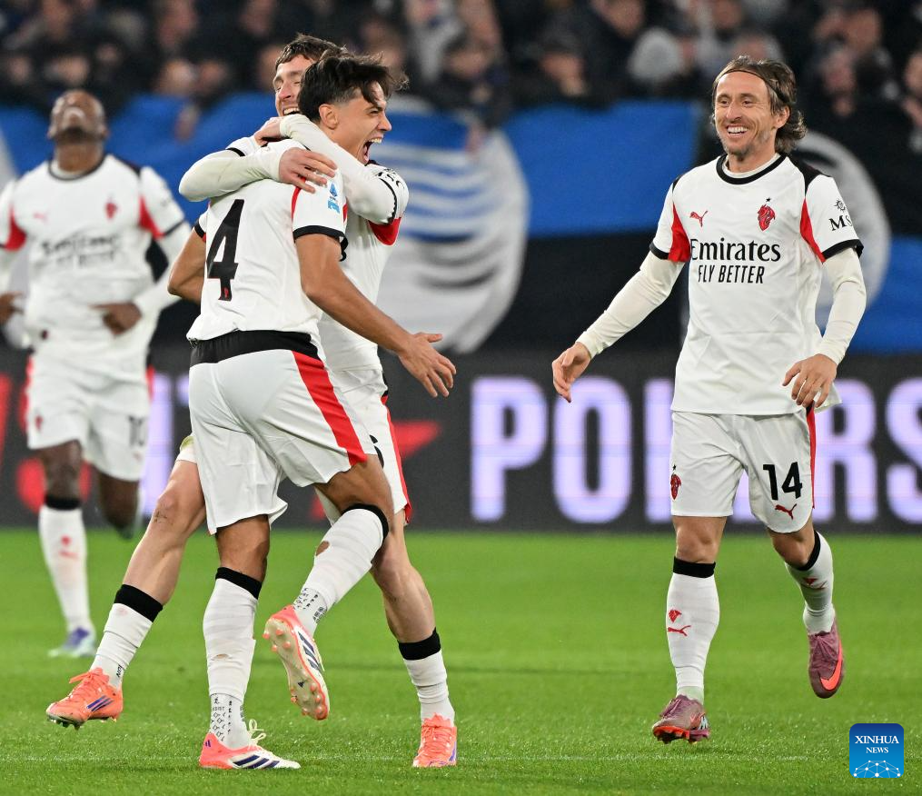 AC Milan's Samuele Ricci (C) celebrates his goal with his teammates during a Serie A football match between Atalanta and AC Milan in Bergamo, Italy, Oct. 28, 2025. (Photo by Alberto Lingria/Xinhua)