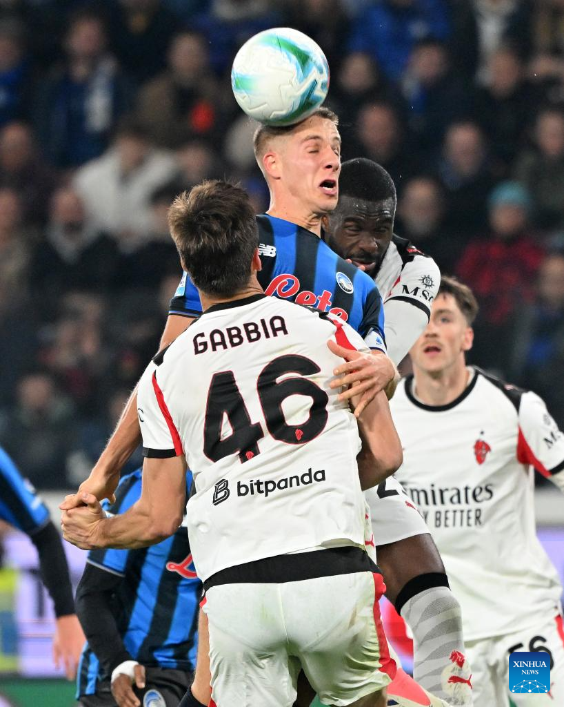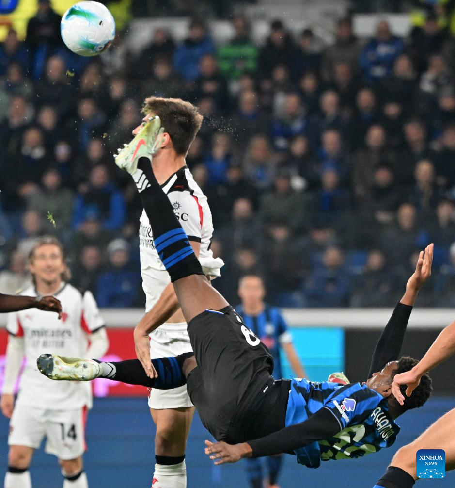 AC Milan's Matteo Gabbia (front) and Fikayo Tomori (2nd R) vie with Atalanta's Mario Pasalic (top) during a Serie A football match between Atalanta and AC Milan in Bergamo, Italy, Oct. 28, 2025. (Photo by Alberto Lingria/Xinhua)