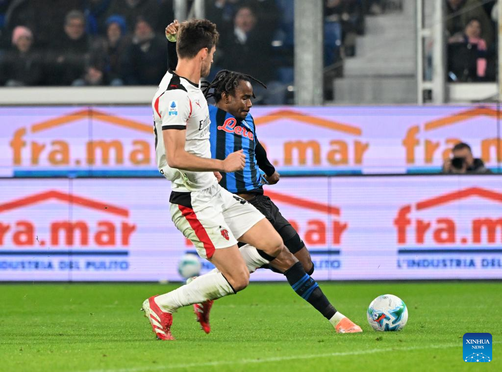 Atalanta's Ademola Lookman (R) shoots and scores during a Serie A football match between Atalanta and AC Milan in Bergamo, Italy, Oct. 28, 2025. (Photo by Alberto Lingria/Xinhua)